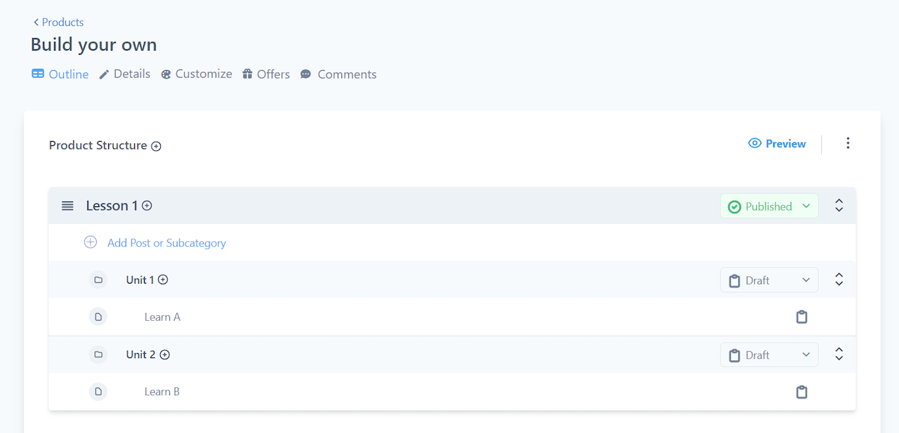 Here's where you'd upload your content. Products function similarly to a folder, within every product you'll have categories > subcategories > posts.